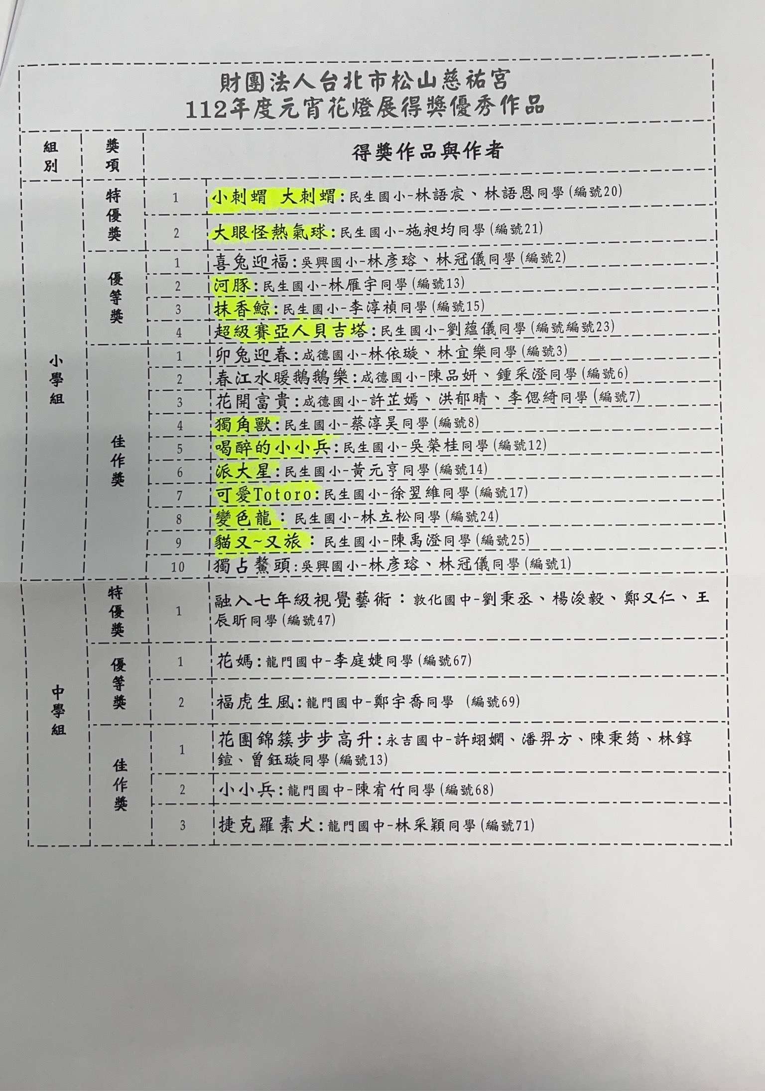 優等:河豚-504林雁宇、抹香鯨-504李淳禎、超級賽亞人貝吉塔-508劉蘊儀