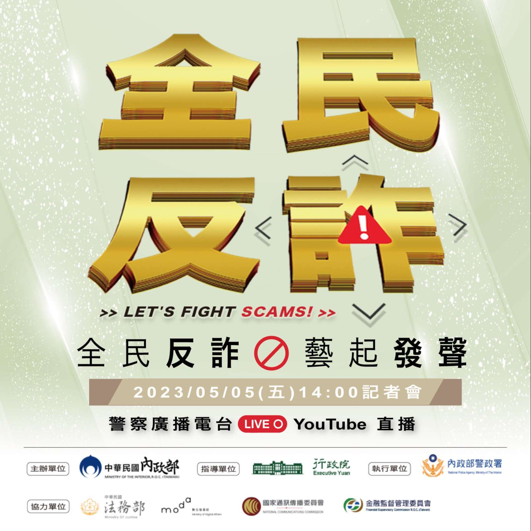 二、為使民眾對反詐議題產生共鳴,營造全民齊心反詐氛圍, 內政部定於112年5月5日14時至16時舉行「全民防詐藝起發聲」記者會及「全民反詐日」擴大宣導活動,俾廣泛觸及全民知悉。