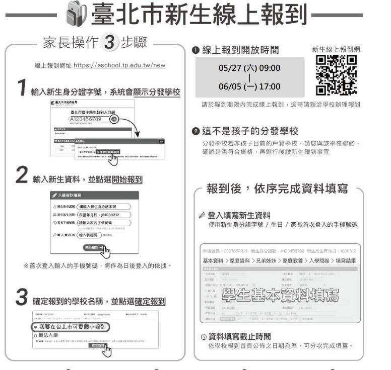 *報到步驟請閱附件-臺北市新生線上報到操作步驟,系統將於6/5(一)17:00關閉。