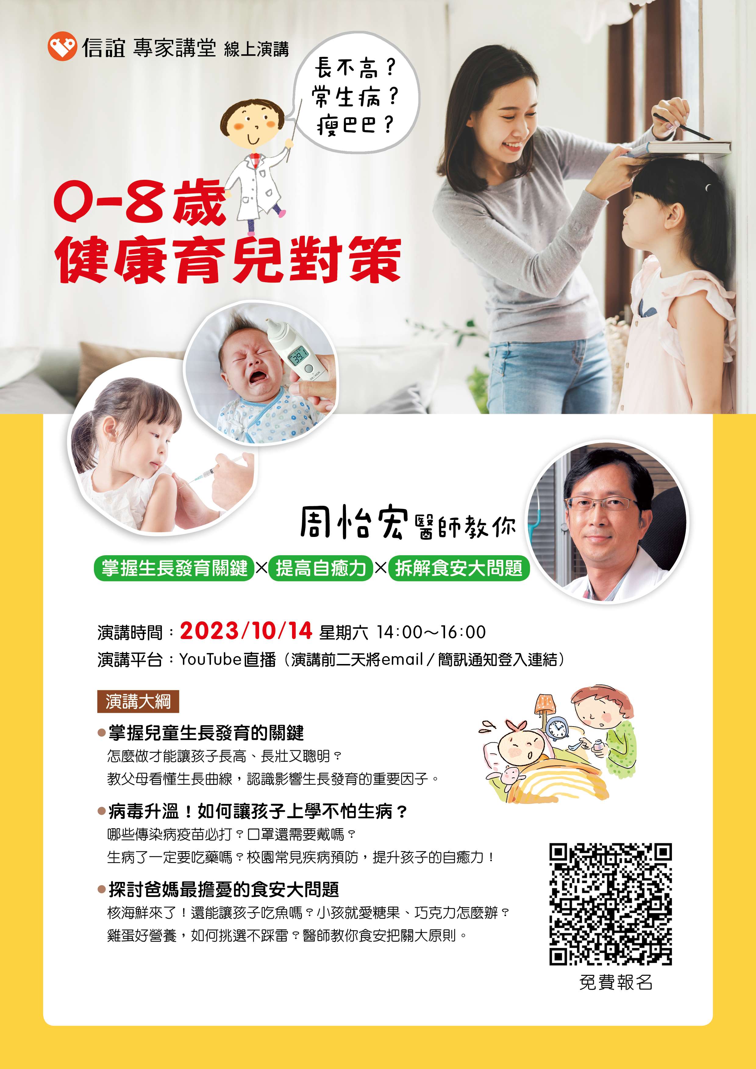 一、孩子平安與健康是父母與老師的最大心願。但是,孩子入 學後經常生病,我們該如何預防並提高自癒力?秋冬正值 各種病毒蔓延,【信誼專家講堂】特別邀請小兒醫學專家~ 周怡宏醫師進行專題演講,周醫師將以30年的醫學知識與 臨床經驗,傳授父母健康育兒的對策。。