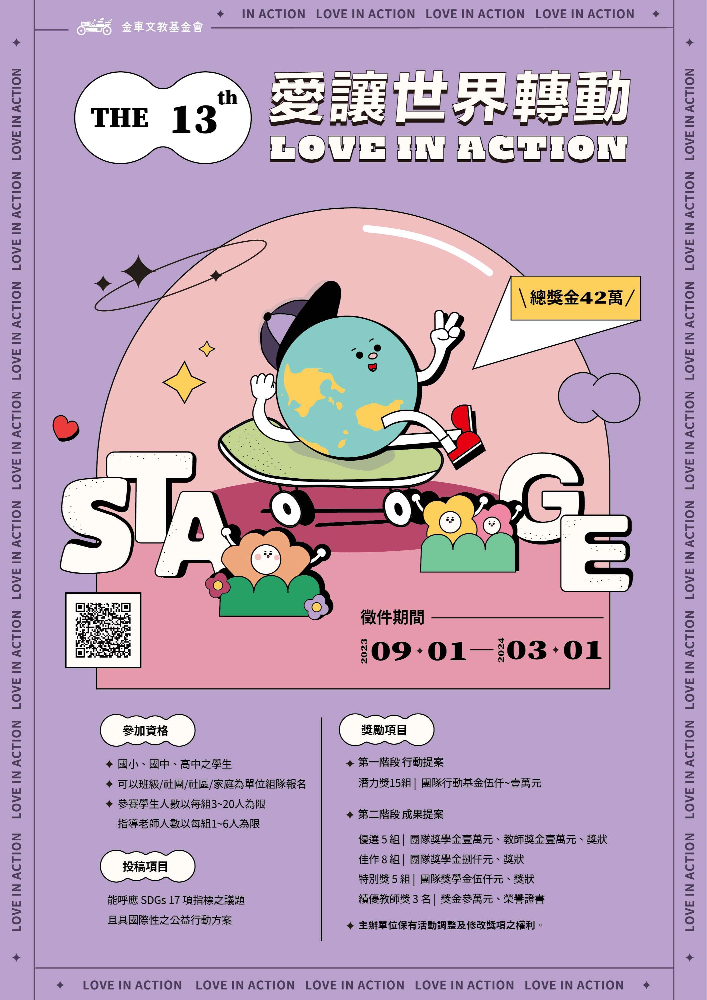 一、本會自2011年開始舉辦「愛讓世界轉動 兒少公益行動」徵 選,以STAGE行動步驟為基礎,從發現問題、創意思考、行 動實踐到收穫反思,鼓勵青年學子以國際視野落實在地行 動,培育下個世代成為具備同理心、行動力及團隊溝通力 之世界公民。