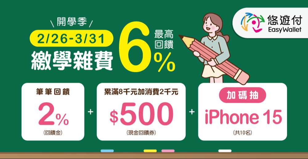 (二)活動內容:活動期間當月使用悠遊付每筆扣款享2%(限量,每戶回饋上限100元)悠遊付回饋金,另累積消費新臺幣(以下同)8,000元加消費扣款滿2,000元即回饋500元指定通路現金回饋券,活動期間每戶最高回饋6%悠遊付回饋金(或回饋券)。
