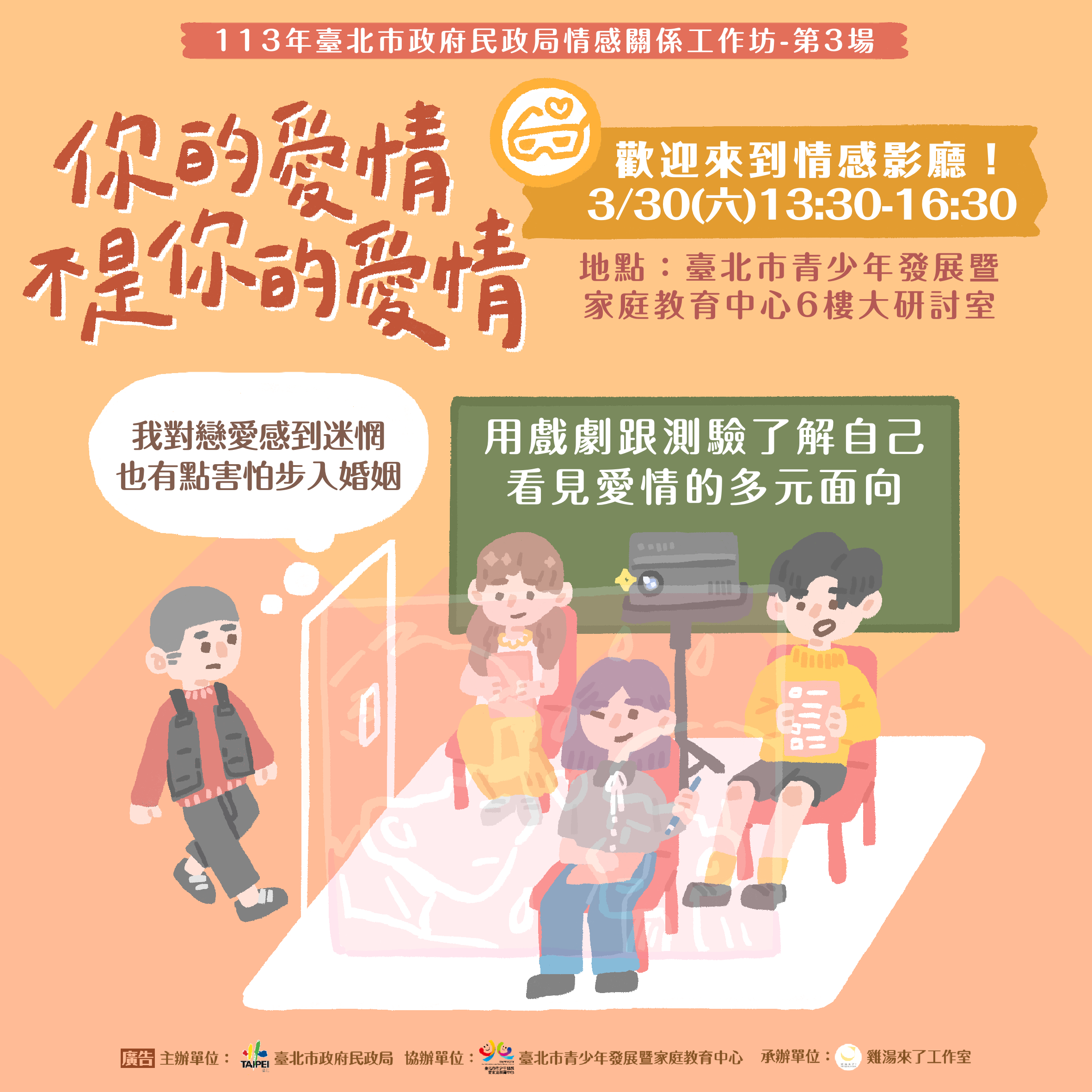 二、第3場次工作坊自即日起至113年3月3日受理報名,採線上 表單報名,凡在臺北市設籍、居住、就學及就業,25至45 歲之單身市民即可報名參加,報名連結與活動詳情請參閱 簡章及本局官網(https://ca.gov.taipei/cp.aspx? n=A1CCB8CCA85C6579)。