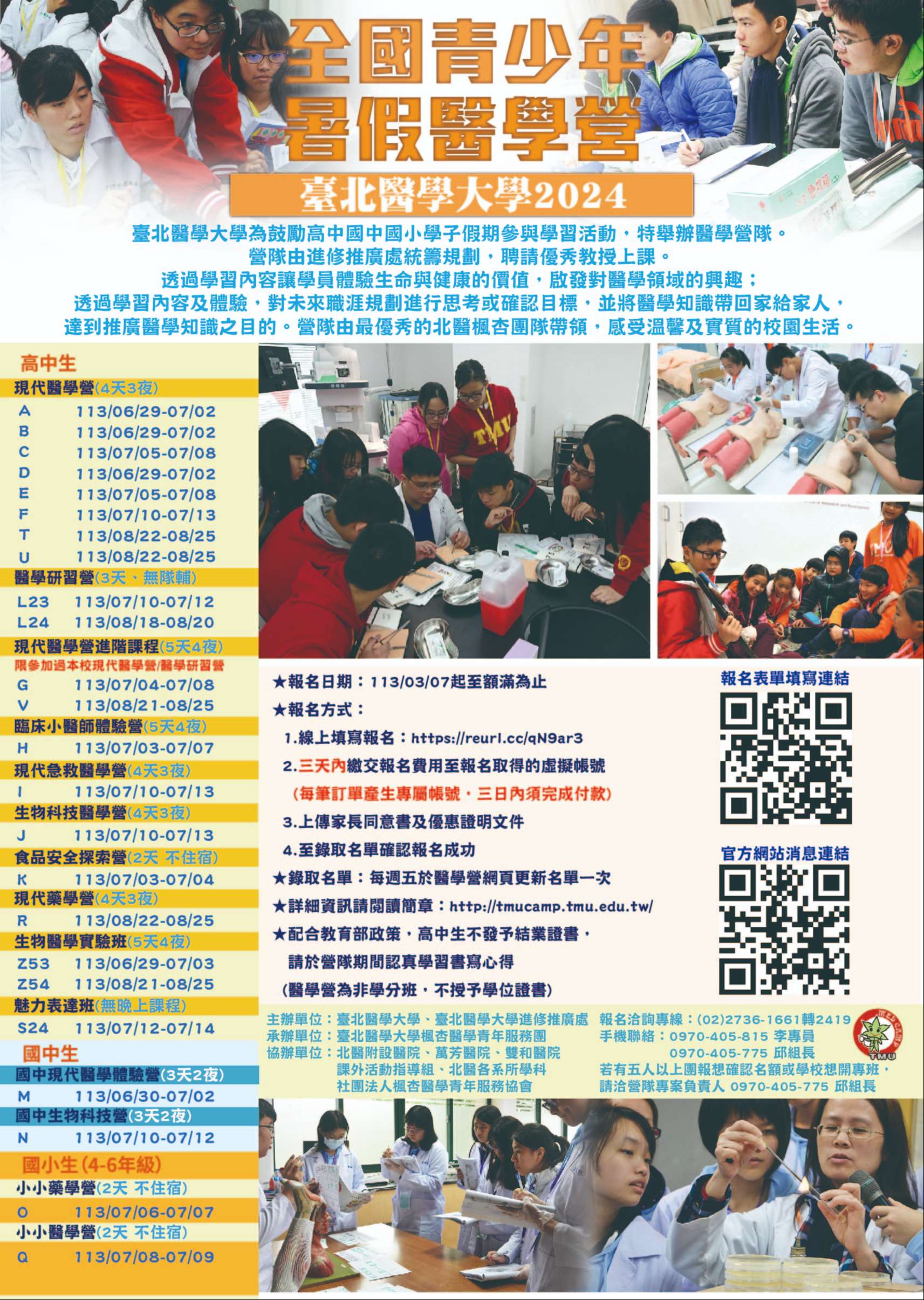 一、營隊資訊:2024暑期醫學營擬訂於民國113年6月29日至8月25日辦理。網址 http://tmucamp.tmu.edu.tw/