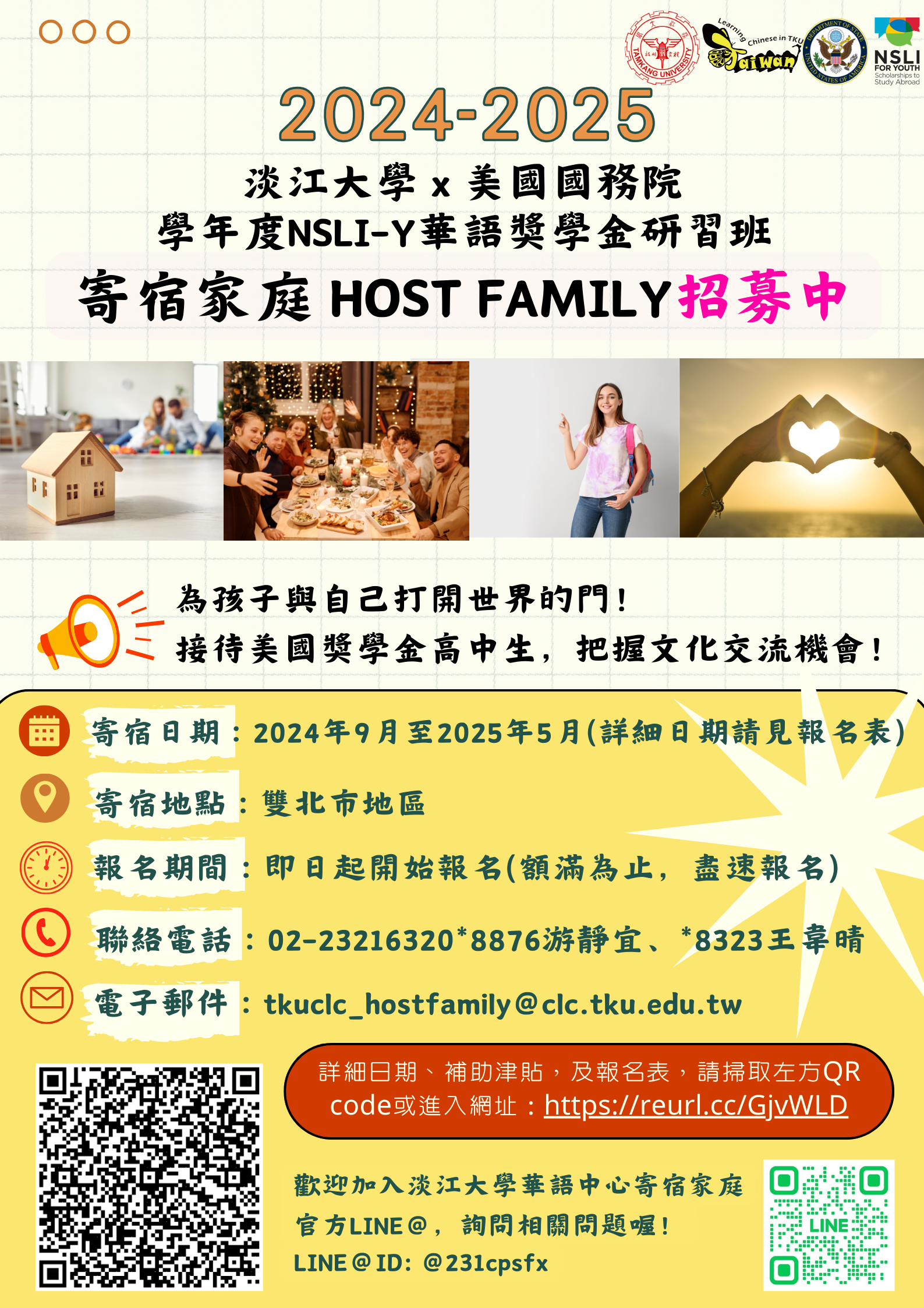 三、寄宿家庭徵選條件如下: (一)寄宿期間:自113年9月14日至114年5月11日的周末、寒 假、春節假期及國定假日等非上課時間。(備註:實際 日期仍須視美方確定可入臺時間,再行調整。)(二)寄宿地點:雙北市地區(近淡水、北投、關渡、士林尤 佳)。 (三)接待條件:需提供學生獨立房間或單人床(上下舖亦 可)、學生寄宿期間的膳食及安排學生與家庭共同出 遊。 (四)補助金額:寄宿家庭每日補助新臺幣1,500元整。