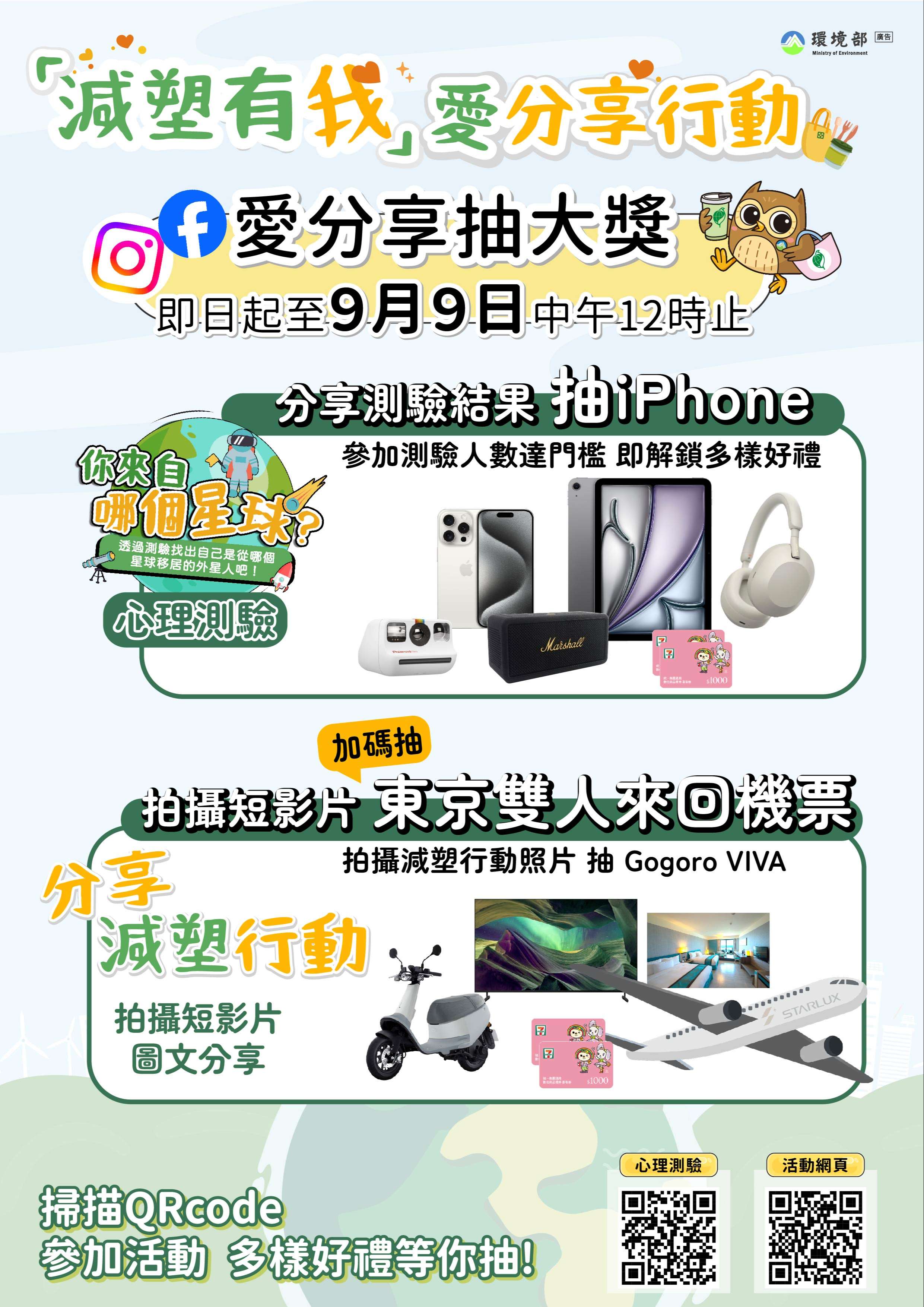 一、環境部為鼓勵社會大眾及莘莘學子在暑期假期間一起跟上全球減少塑膠的風潮,特辦理「減塑有我」愛分享行動, 可透過臉書(Facebook)、Instagram(IG)等社群媒體, 拍攝個人生活中減塑短影片、減塑生活照片,並可透過參 加「你來自哪個星球?」心理測驗遊戲,瞭解並發覺屬於自己獨特的環保行動,歡迎民眾邀請親朋好友一起在生活中響應減塑行動,參加旨揭活動拿大獎。