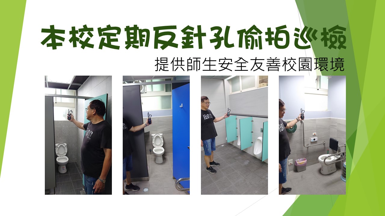 為提供友善安全校園環境,本校定期進行反針孔偷拍巡檢。目前已完成開學前巡檢工作,請家長們安心!