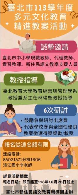 研習日期: (一)113年11月09日(六),09:30-11:30; (二)113年12月14日(六),09:30-11:30; (三)114年10月04日(六),09:30-11:30; (四)114年03月15日(六),09:30-11:30; (五)114年04月12日(六),09:30-11:30; (六)114年05月17日(六),09:30-11:30。