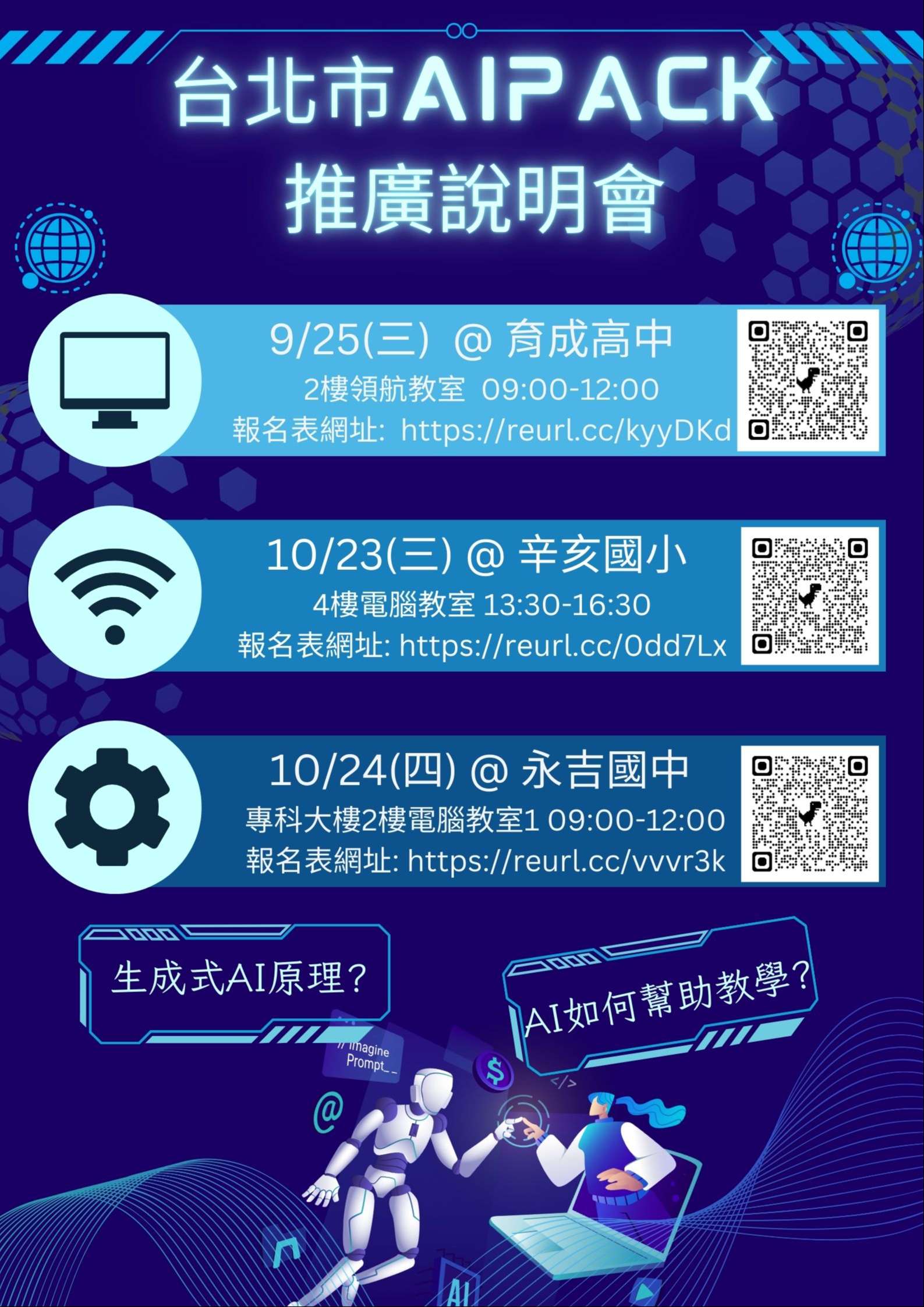 (三)場次三:1、研習時間:113年10月24日(星期四),9:00-12:00。2、研習地點:臺北市立永吉國民中學專科大樓2樓電腦教室。3、報名網址:https://reurl.cc/vvvr3k4、報名截止日期:113年10月16日(星期三)上午12點。