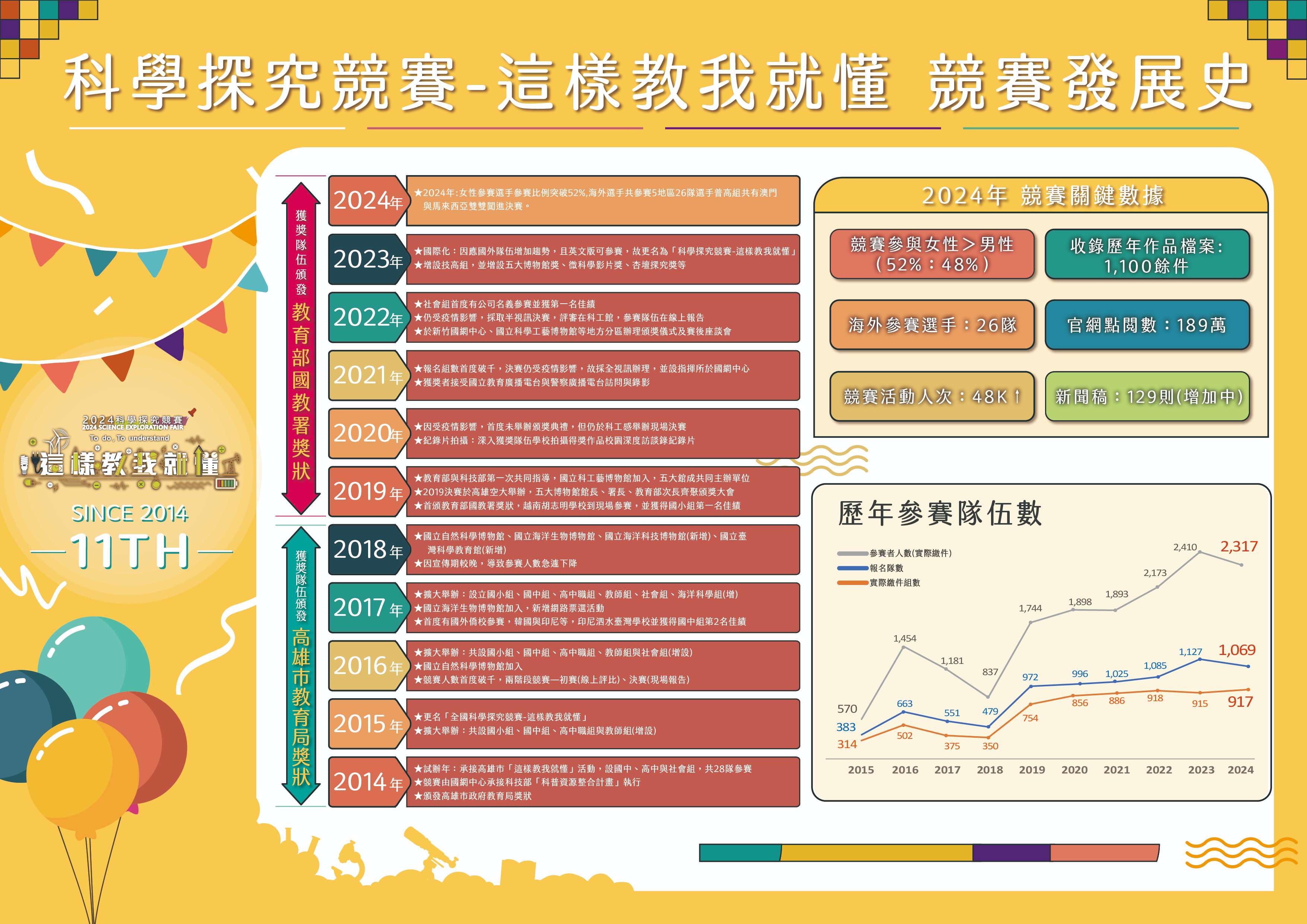 二、旨揭競賽活動自2014年起迄今已辦理10年,指導單位為教 育部國民及學前教育署,共同主辦單位為國立自然科學博 物館、國立海洋生物博物館、國立海洋科技博物館及國立 臺灣科學教育館、國立科學工藝博物館、國家高速網路與 計算中心、國立臺灣師範大學及國立高雄師範大學。競賽分為國小、國中、普高、技高、教師及大專/社會組。