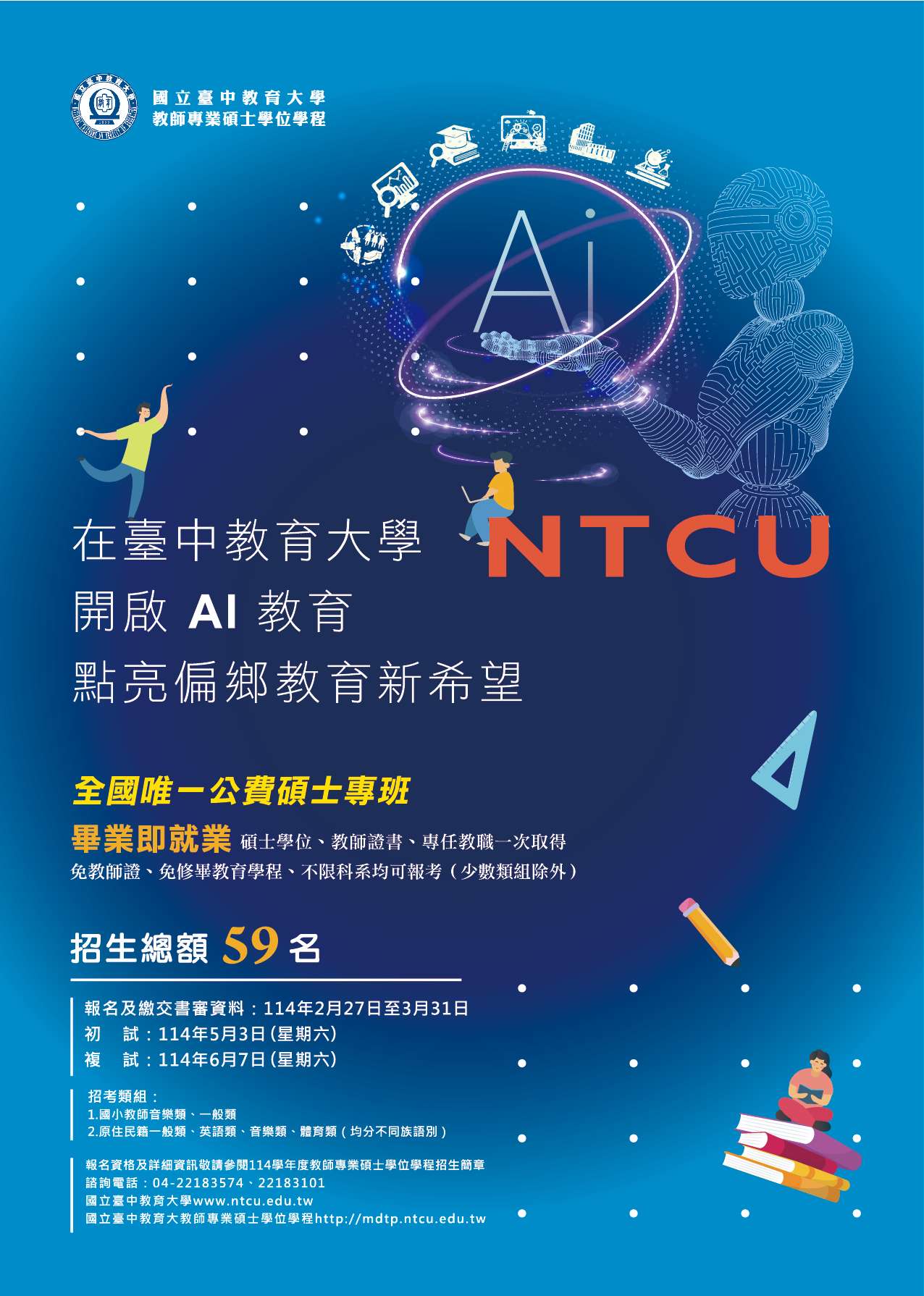 二、114學年度招生考試自114年2月27日至3月31日報名(含繳 交書審資料),5月3日初試,6月7日複試,招生簡章請參閱招生資訊網(https://as.ntcu.edu.tw/)。