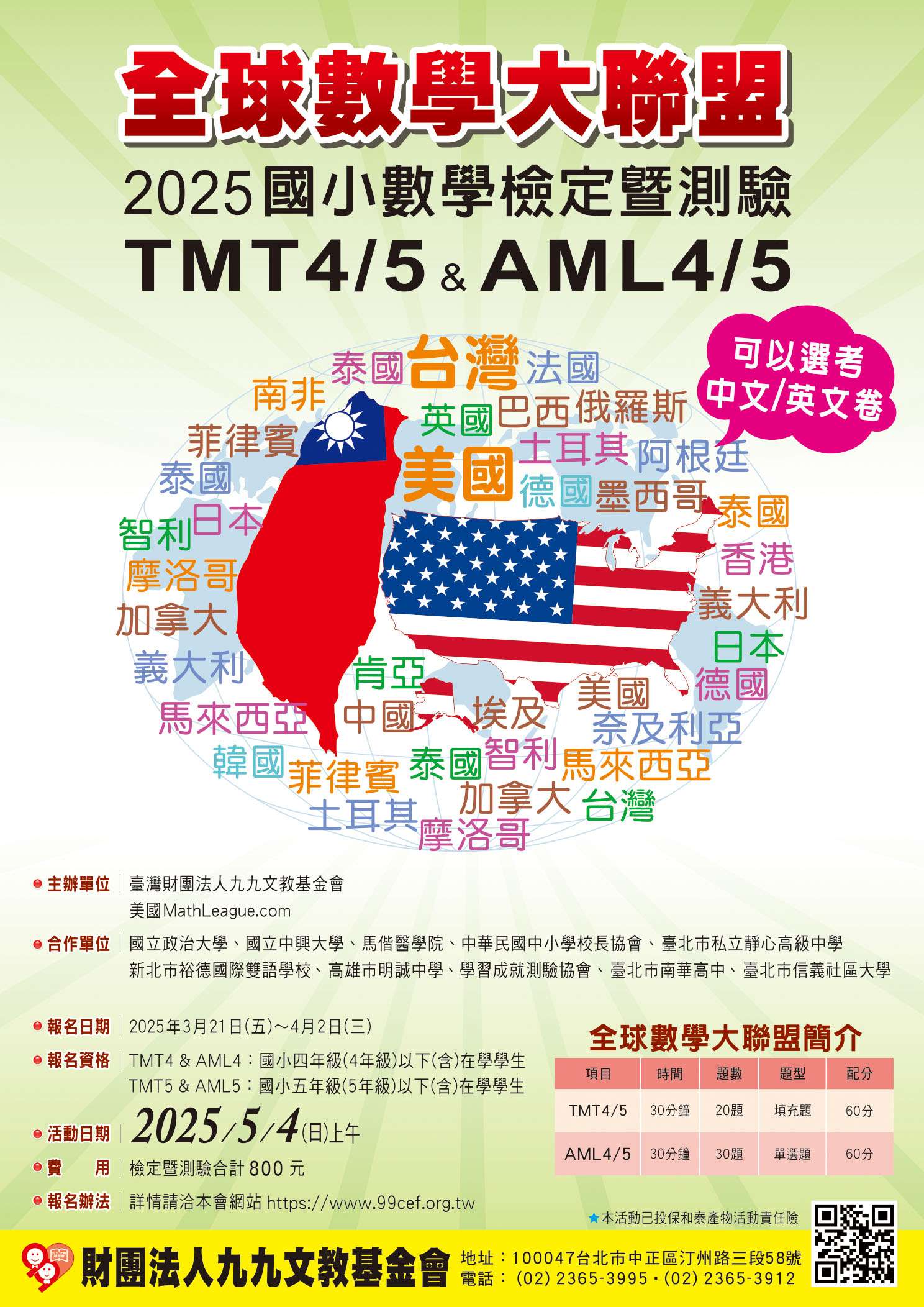 三、項目說明: (一)TMT為依照國內現行課綱命題之檢定。 (二)AML為美國MathLeague.com所主辦之國際檢測。