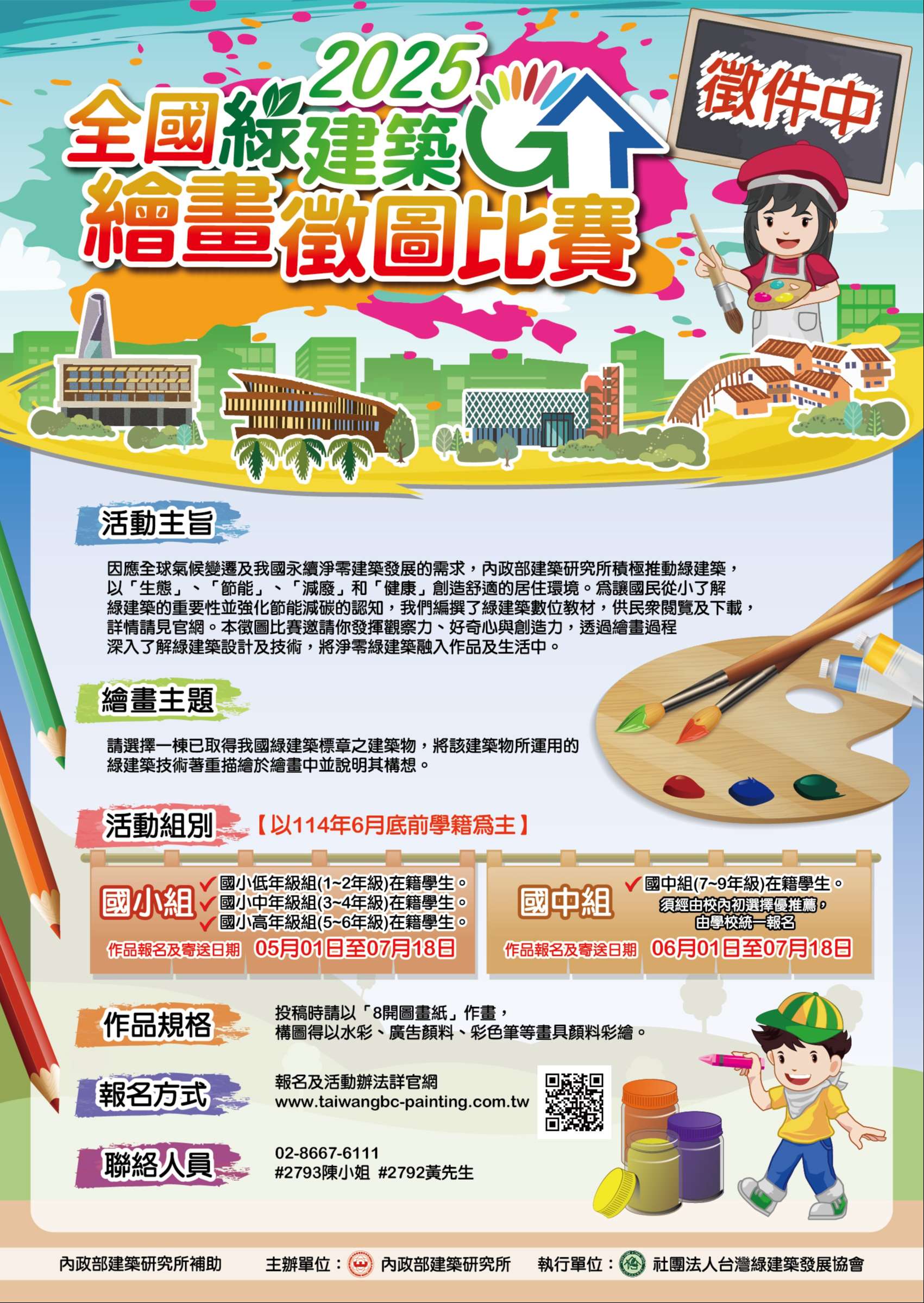 (一)國民小學組參賽資格: 1、低年級組1~2年級在籍學生。 2、中年級組3~4年級在籍學生。 3、高年級組5~6年級在籍學生。 (二)繪畫主題:以取得綠建築標章建築物或優良綠建築為 主,用創意巧思將綠建築基本概念呈現於繪畫中,俾以 展現臺灣綠建築之美。(三)參賽作品報名及送件時間: 1、參賽作品網路報名:114年5月1日至7月18日。 2、參賽作品寄送截止:114年7月18日下午5時前。 (四)活動詳情與報名資訊,請至社團法人台灣 綠建築發展協會比賽官網(www.taiwangbc-painting. com.tw)查詢,或撥打聯絡電話(02)8667-6111分機 2793、2792洽詢。