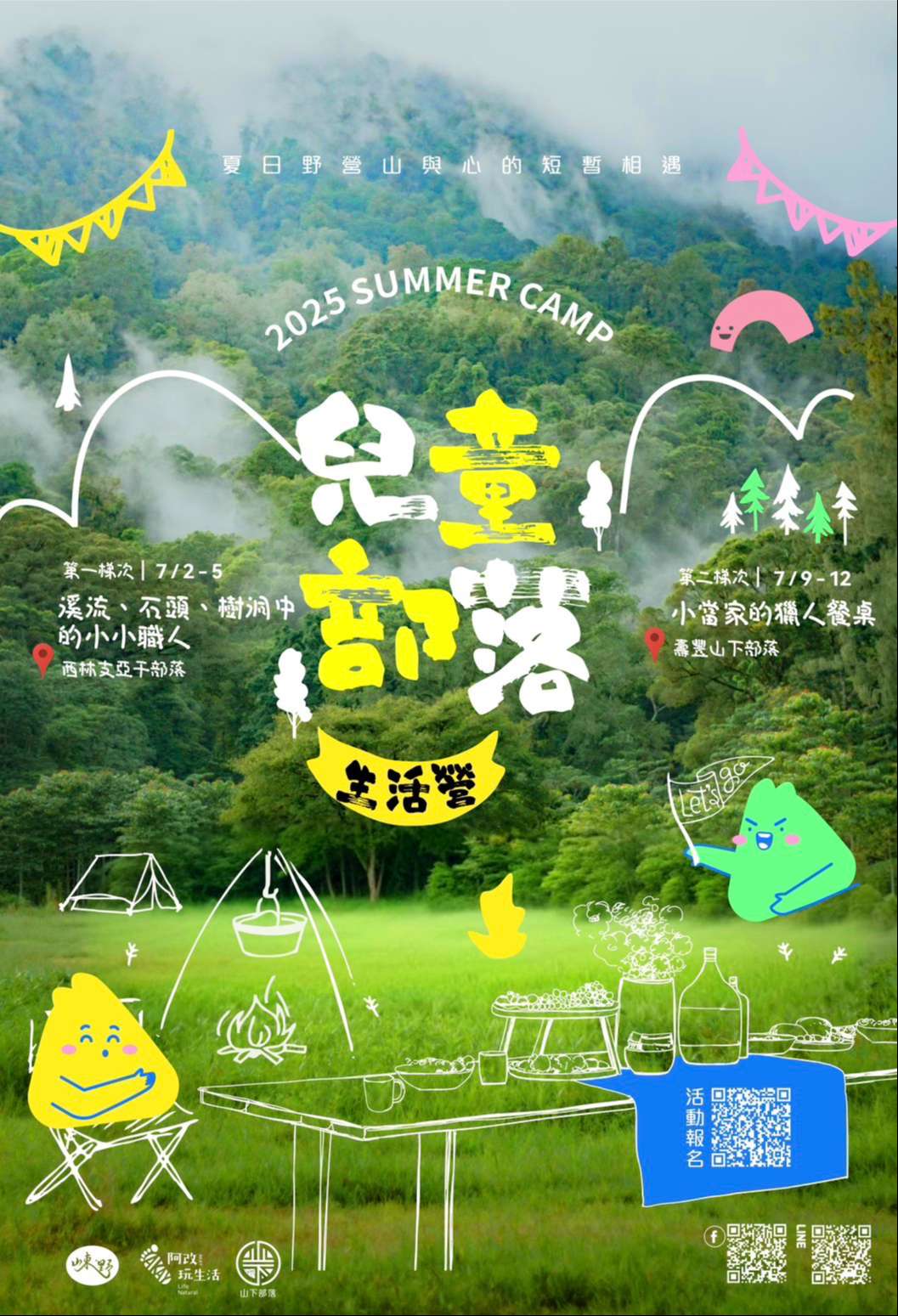 二、活動分兩梯次進行,營隊期間皆為四天三夜: 1、第一梯次:「溪流、石頭、樹洞中的小小職人」 日 期:114年7月2日至7月5日 地 點:花蓮縣萬榮鄉支亞干部落 2、第二梯次:「山下小當家的獵人餐桌」 日 期:114年7月9日至7月12日 地 點:花蓮縣壽豐鄉山下部落(山下基地) 三、報名對象為全台國小三至六年級學生(以暑假前年級為 主)每梯次限額20人,額滿採審核制錄取。花蓮縣內學童 享有七折優惠。四、報名時間自即日起至114年5月21日止,報名表單如附 https://reurl.cc/eMpgnK,錄取將以Email通知並辦理繳 費。 五、營隊最後一日舉辦成果展,歡迎家長到場參與。