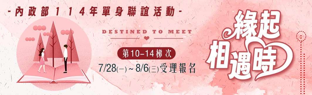 內政部114年「緣起相遇時」單身聯誼活動第10-14梯次訂於7月28日至8月6日受理報名,歡迎單身者踴躍報名。活動詳情及報名資訊請參閱內政部戶政司全球資訊網(主題資訊—單身聯誼活動專區)。