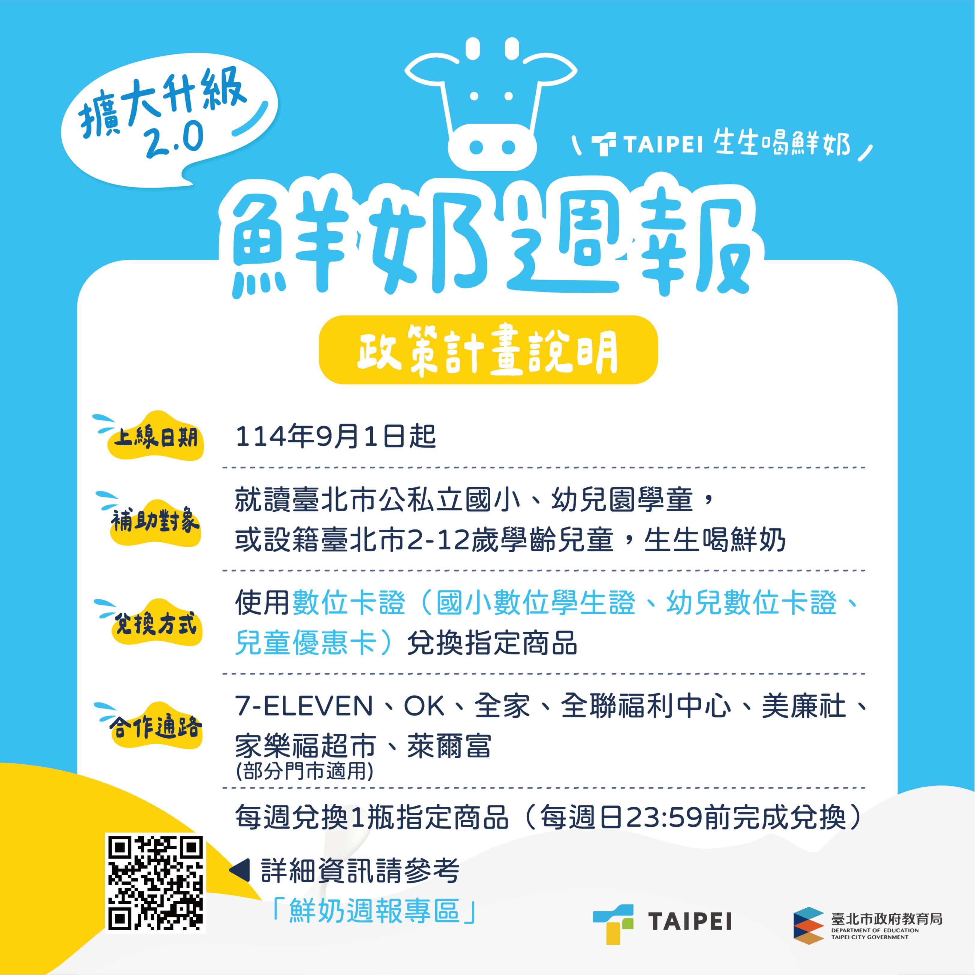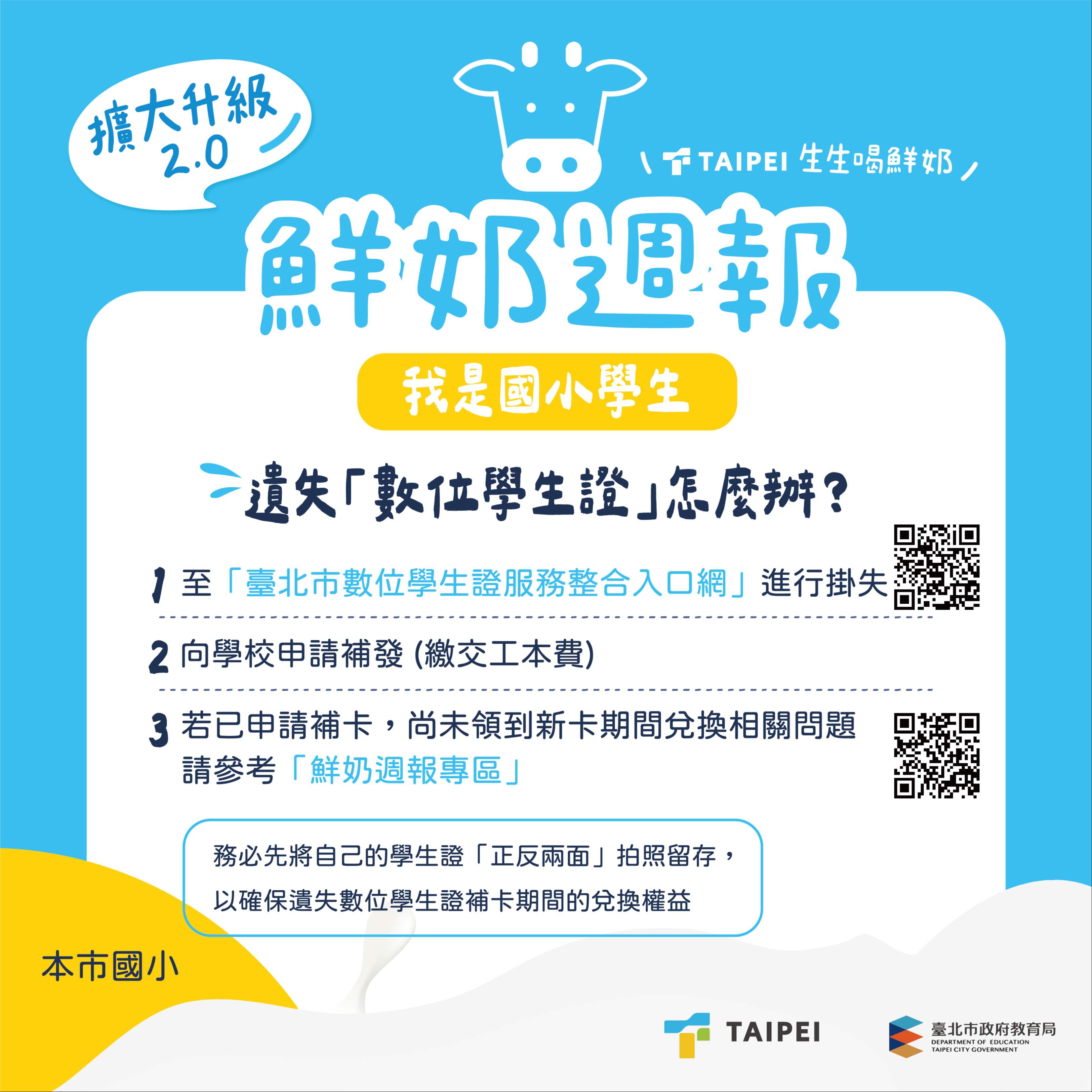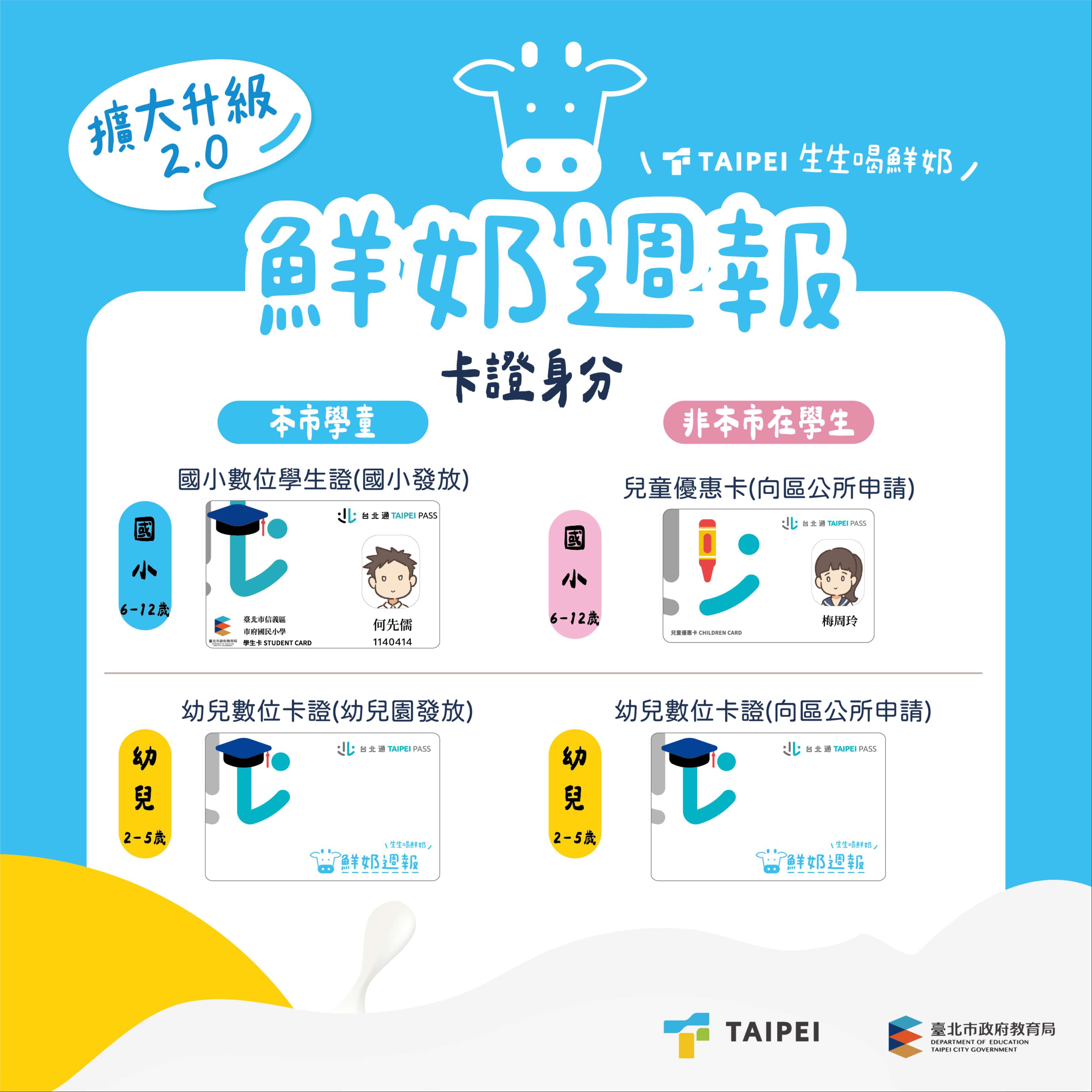 鮮奶週報9月1日擴大升級!就讀或設籍臺北市2-12歲學齡兒童,憑數位卡證至指定通路即可兌換鮮奶或豆漿,全年不中斷!其他詳情請參閱附件!
