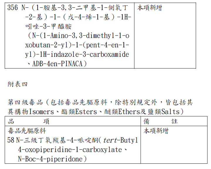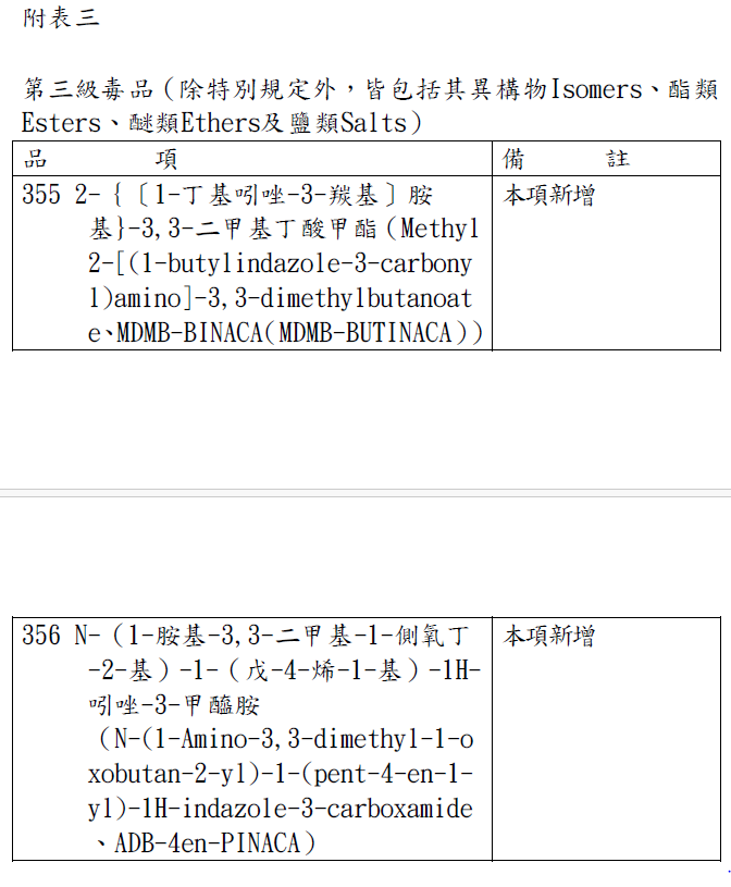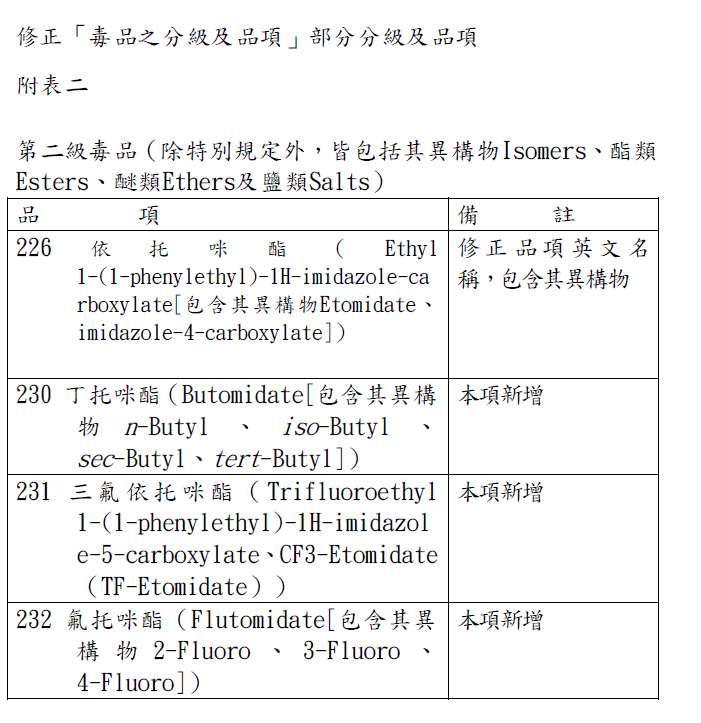 法務部函報依「毒品危害防制條例」第2條第3項規定應行公告調整、增減之「毒品之分級及品項」部分分級及品項,業經本院於中華民國114年8月25日以院臺法字第1141023110號公告修正,並自114年8月27日生效。