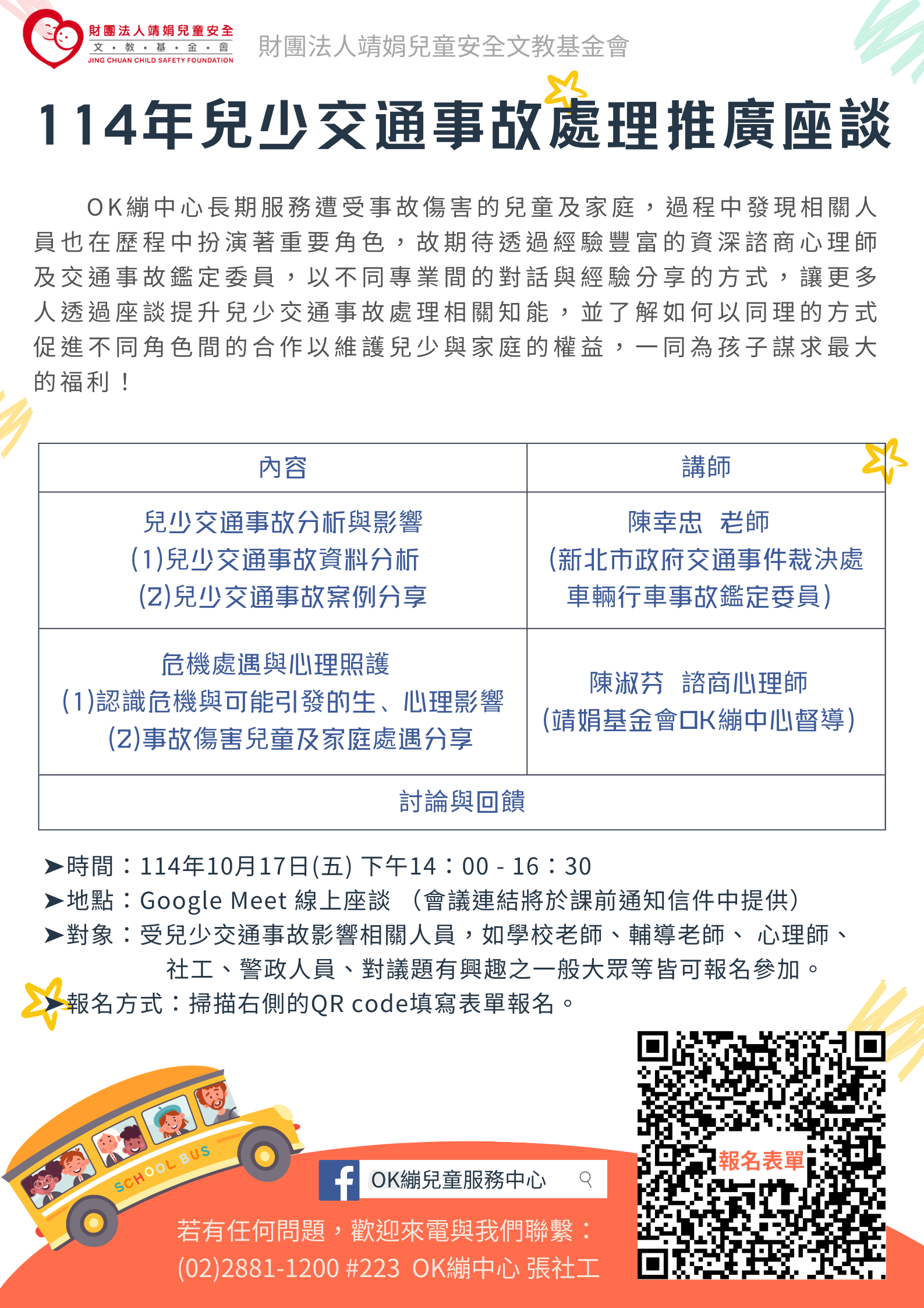 靖娟基金會OK繃兒童服務中心將於114年10月17日14時至16時30分辦理兒少交通事故處理推廣線上座談,期待透過對話方式交通、心理、社會等角度分享中心協助處理交通事故的服務經驗傳達給更多相關工作者,讓不同專業之間以同理的態度更了解彼此,一同協助為孩子謀取最大的利