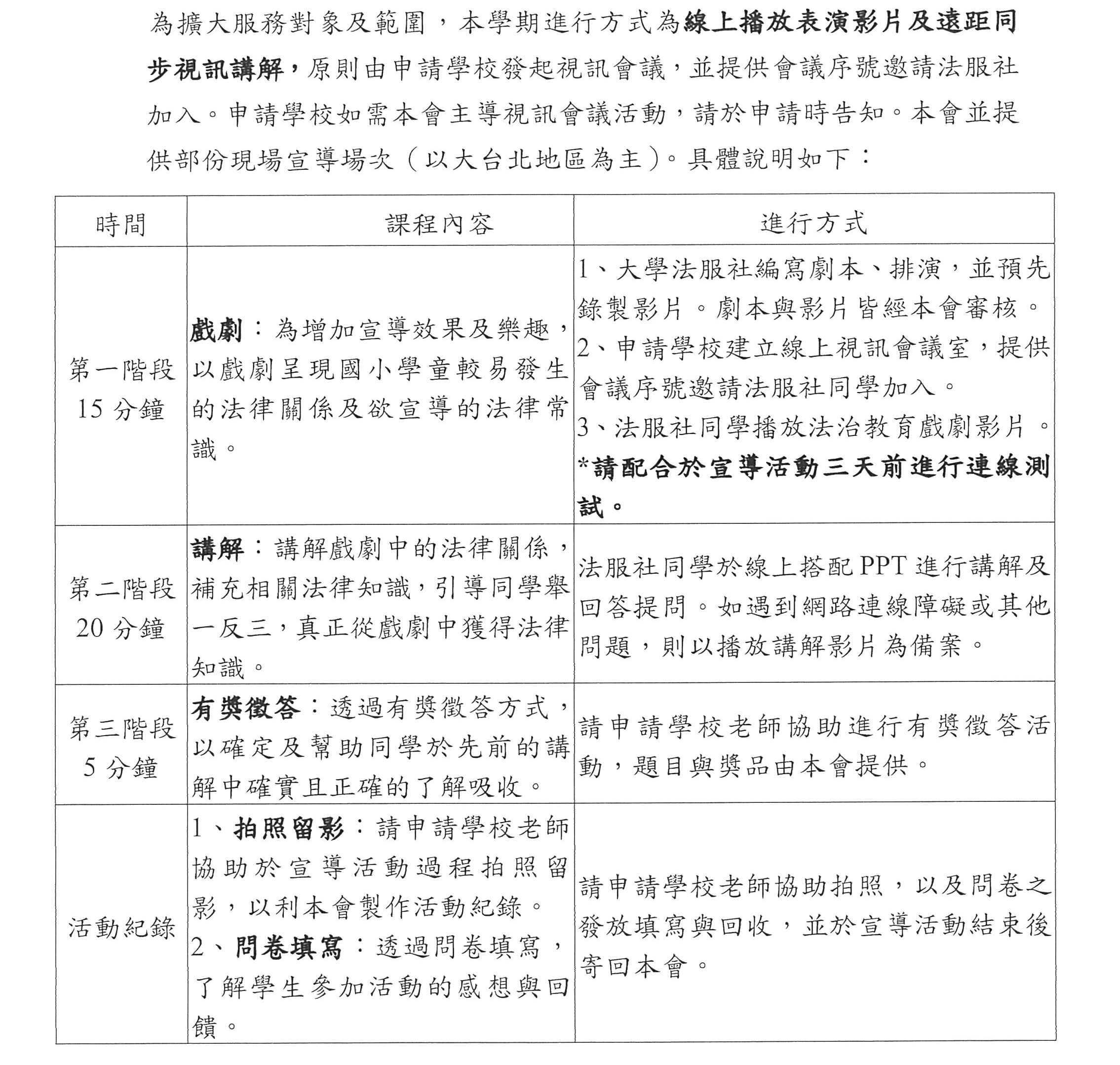 二、旨揭活動為使法治教育向下扎根,透過戲劇表演方式傳遞法治觀念,以防範少年誤觸法網於未然。