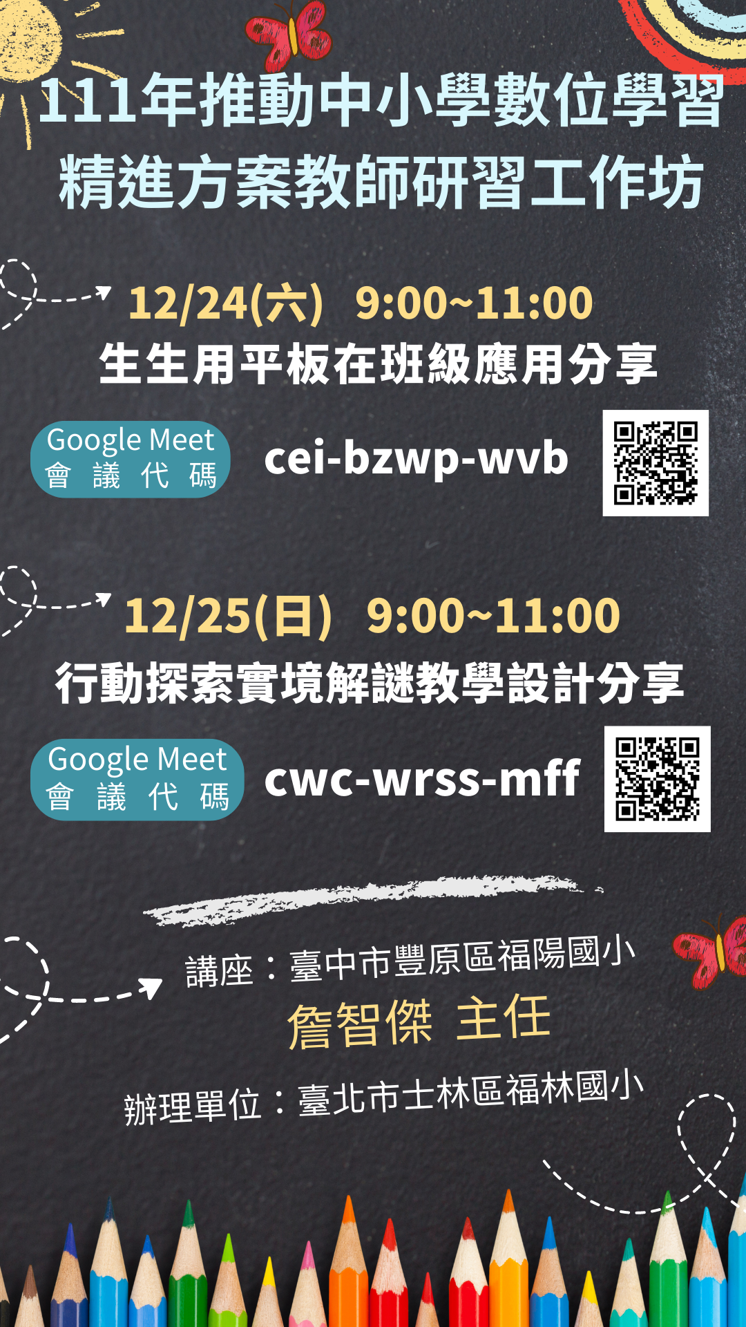 (一)111年12月24日(六)上午9:00-11:00,主題:生生用平板 在班級應用分享。Google Meet會議室連結: https://meet.google.com/cei-bzwp-wvb。