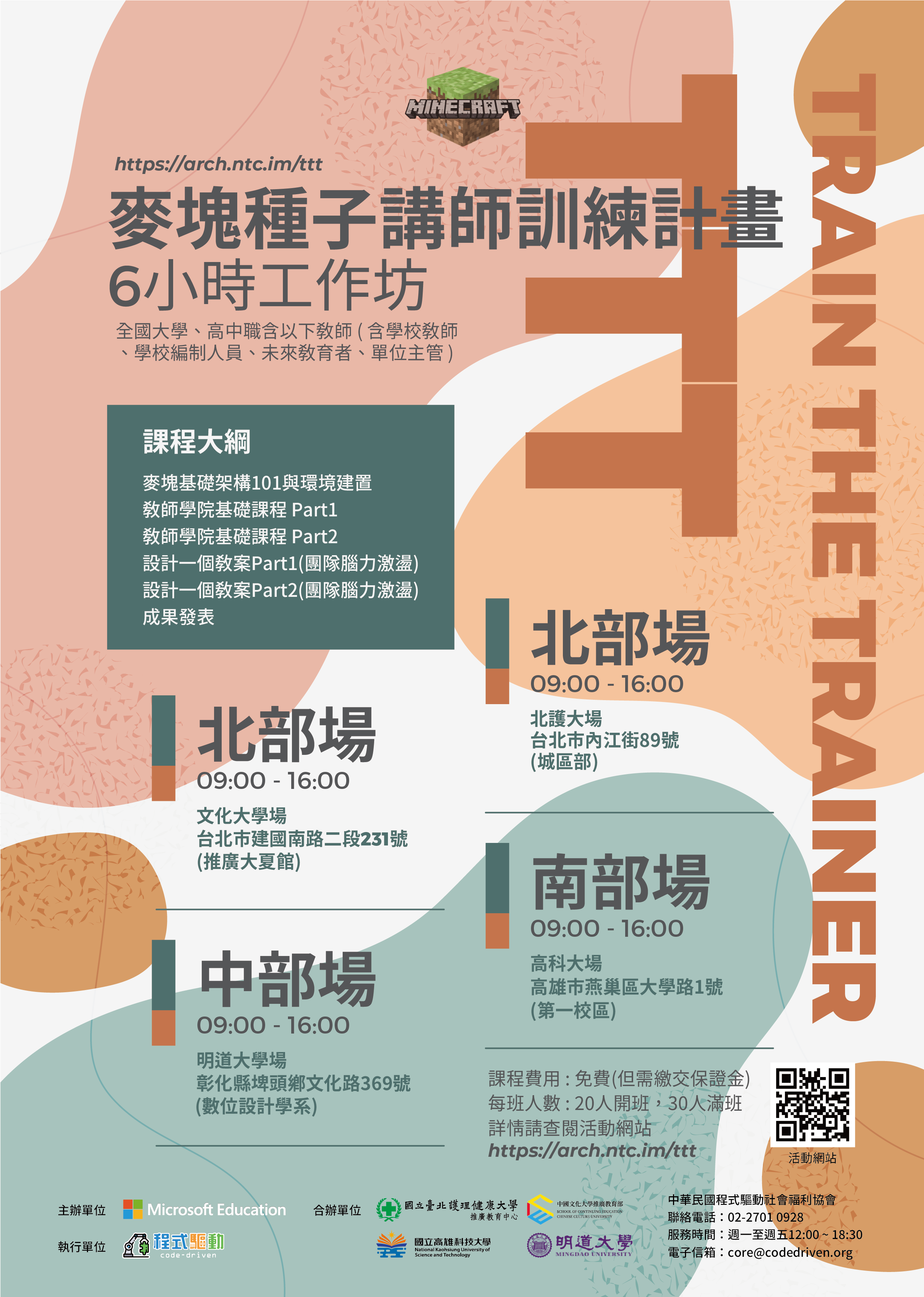 五、免學費但須事先繳交保證金。凡完成研習之教師,皆可獲 得麥塊種子講師訓練專屬紀念T-shirt一件與研習紀念貼紙 一份等。