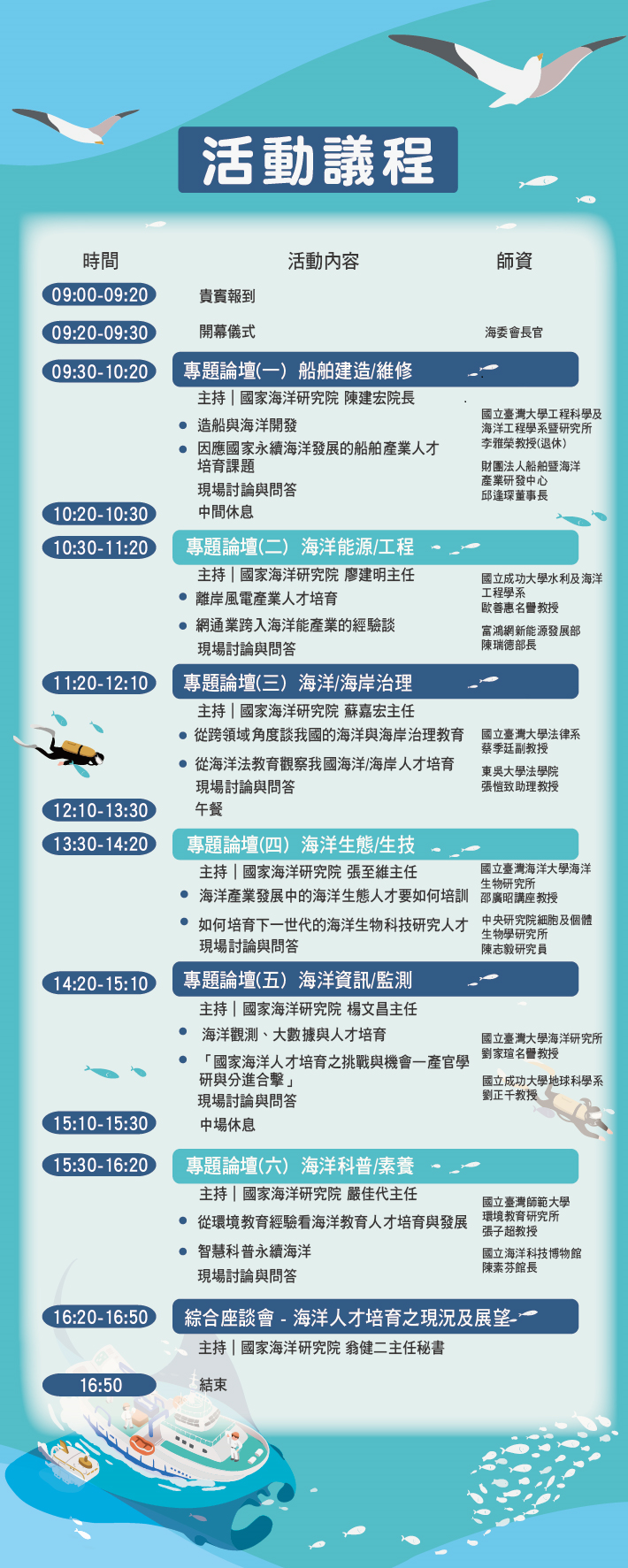 二、配合第四屆國家海洋日系列活動,國家海洋研究院特舉辦旨揭論壇,以「邁向下一個十年的永續海洋」為主題,辦理6場次專題講座(船舶建造/維修;海洋能源/工程;海洋 /海岸治理;海洋生態/生技;海洋資訊/監測;海洋科普/ 素養)進行專題分享。